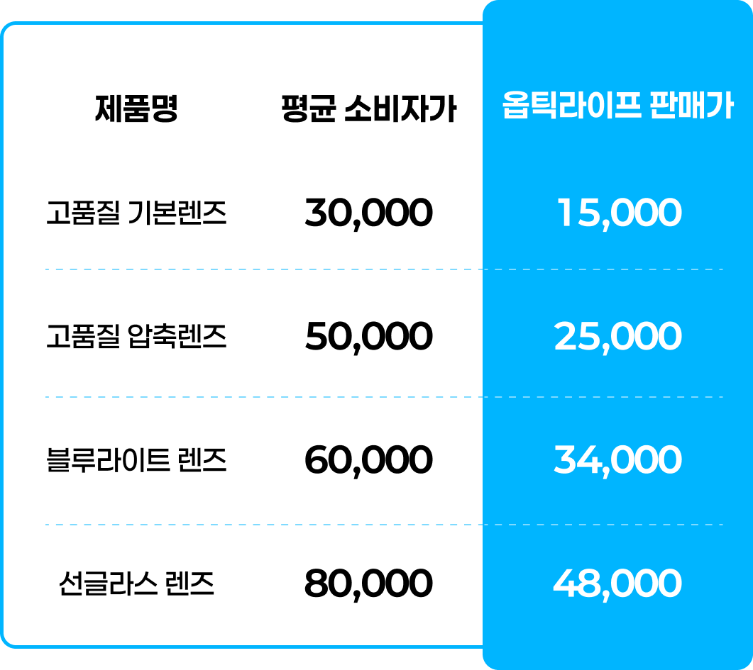 * 상기 가격은 주요 제품 가격이며, 옵틱라이프 가격표에는 더 다양한 제품가가 시장가 대비 30~50% 저렴하게 책정되어 있습니다.